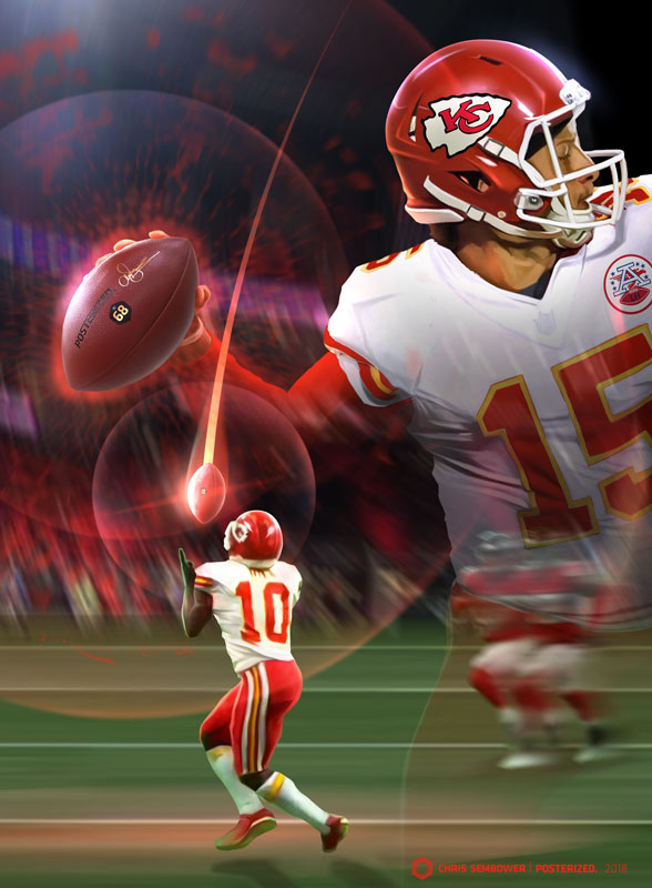 This painting came out of the Chiefs '18 preseason game against the Falcons. Patrick Mahomes let one rip to Tyreek Hill almost 70 yards through the air for a touchdown. That 68 yard pass would have been good for the longest pass of the last year by almost seven whole yards. Though it was only a preseason play, it highlighted why fans are so excited to see Mahomes paired with Hill - a strong arm / speed duo the NFL may have never seen before.